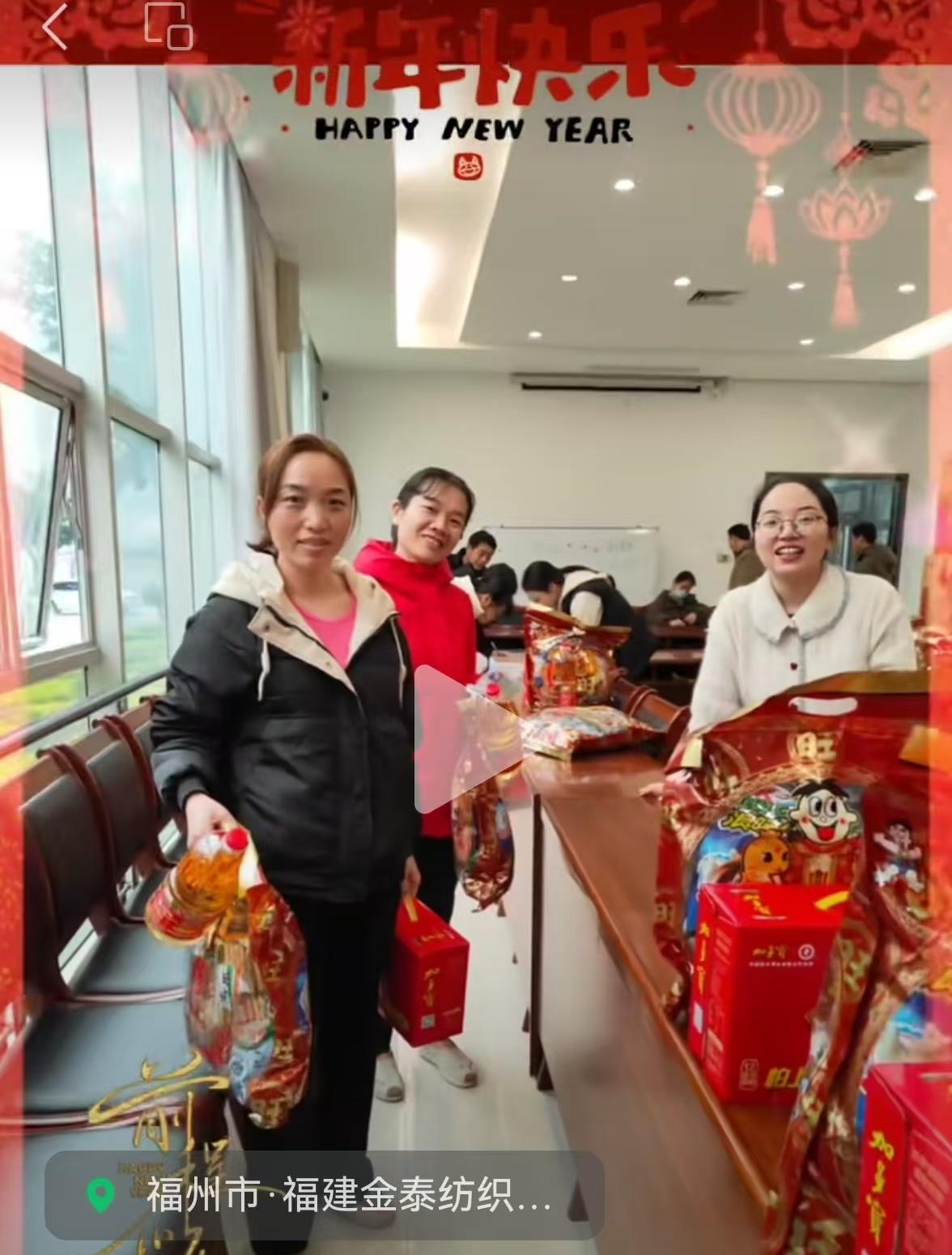 2025年1月23日,值此春節(jié)來臨之際,永泰縣金泰紡織有限公司為全體員工送上了春節(jié)福利,讓每一位員工帶著滿滿的幸福感迎接新春的到來。一份份包裝精美的福利禮包,懷揣著溫暖送到每一位員工手中,為每位員工的新年增添一份喜悅與祝福。當員工們接過沉甸甸的節(jié)禮時,臉上洋溢出幸福的笑容。